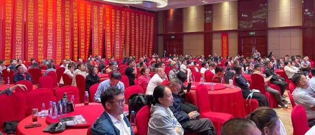 会议现场布置得富丽堂皇,水晶吊灯璀璨夺目,四周悬挂着诸多祝贺条幅,满溢着喜庆氛围。偌大的会场座无虚席,几百位参会者齐聚一堂,或专注聆听,或认真记录,共同见证会议的精彩时刻,气氛十分热烈。
