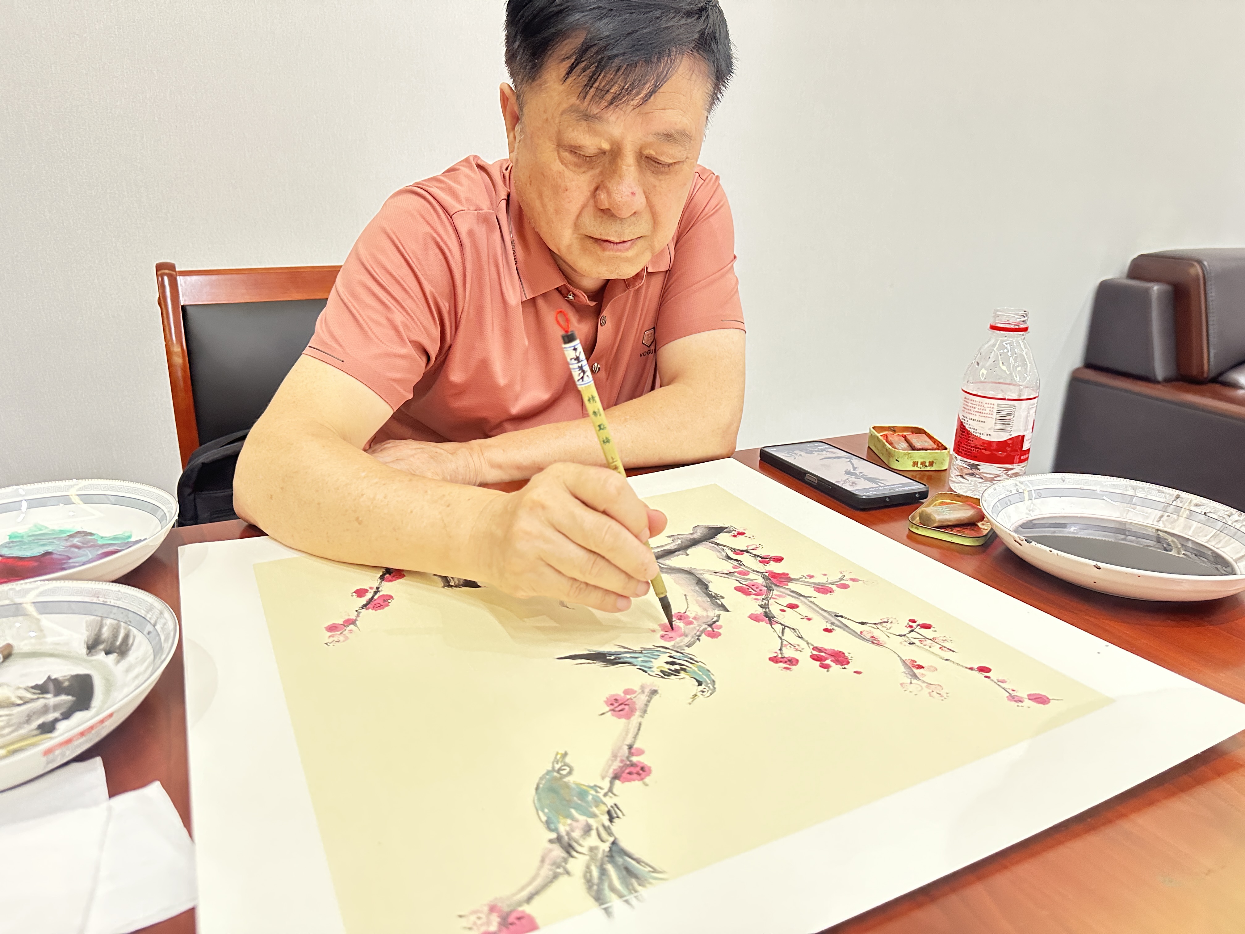 中国数字电视《社会与法》栏目河南安阳讯:(史海军) 8月6日下午,安阳市农工民主党书画院一行10余人在院长李昕的带领下,走进素有“中国铁合金第一镇”之称的曲沟镇,在安阳市正硕新材料有限公司开展主题为“文化赋能·匠心筑梦”的书画交流活动。名誉院长秦保家、副院长吴景晨、副秘书长史海军,以及著名书画家李亮、栗克、方金英等艺术家齐聚一堂,以笔墨为桥梁,共话企业文化与艺术融合发展新路径。