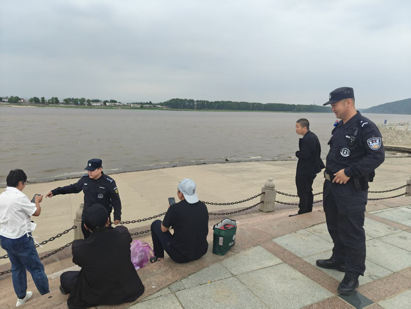 见此情形,晋铭宇和田彭立刻快步上前,礼貌且严肃地提醒游客:“近期降雨频繁,江面水位上涨,水流湍急,你们离江面太近了,非常危险,游玩过程中一定要远离江面,注意自身安全。”游客们听后,脸上露出后怕的神情,纷纷表示感谢民警的及时提醒。