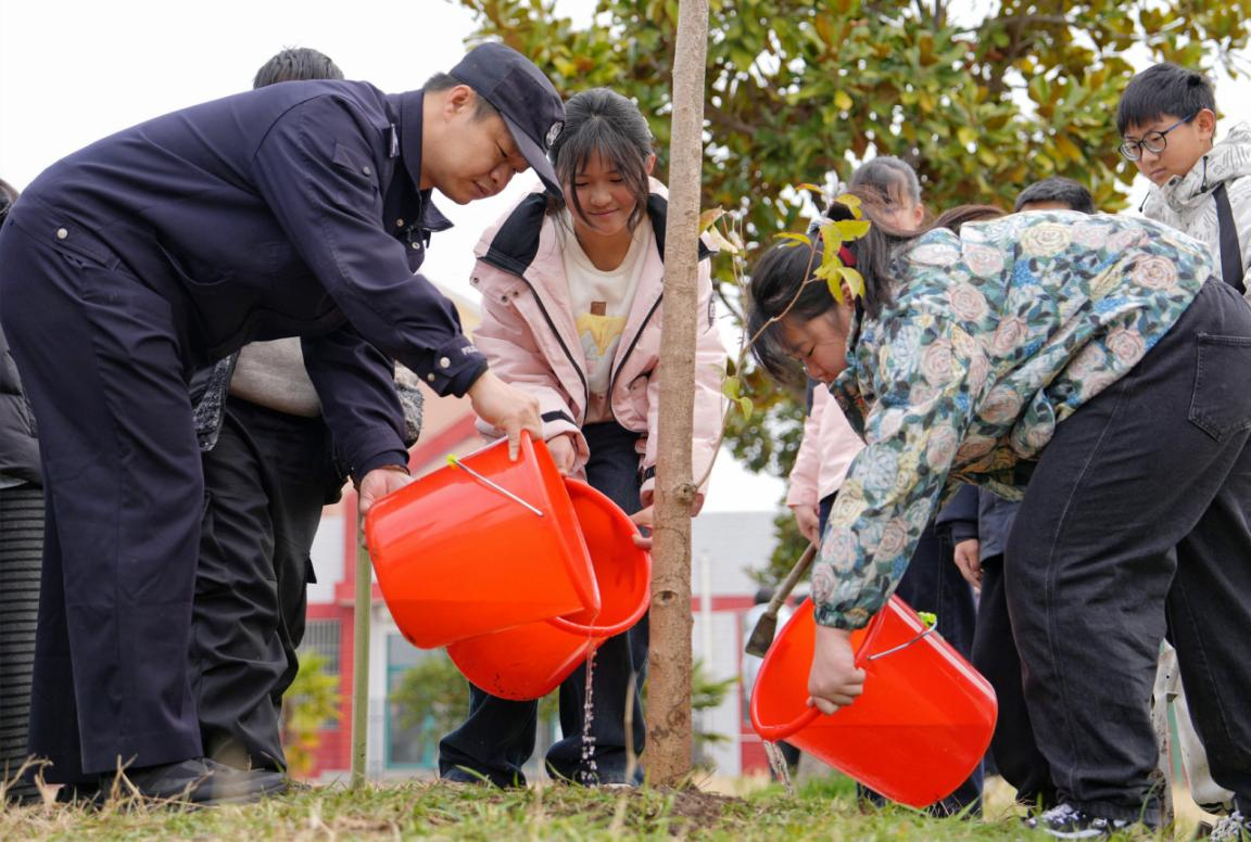 活动现场,植树环节井然有序。伴随着派出所赠送的一棵棵嫩绿树苗的落地,民警与师生们分工协作,扶苗、填土、踩实、浇水,每一步都细致认真。这些承载着祝福与希望的树苗,不仅为校园增添了新绿,更象征着青春的蓬勃生机。孩子们在亲手栽种中深刻领悟了“爱护自然、绿化家园”的意义,践行了绿色发展理念。