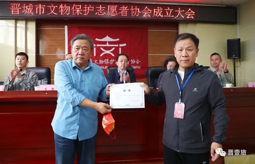大会由副主席焦庆峰主持。会上,市文旅局副局长郑忠社宣读了《晋城市文物保护志愿者协会成立批复文件》。王国瑞当选协会主席。他表示今后将认真履行主席职责,团结好理事一班人,努力做好各项工作。李强主任代表山西省文博之家对晋城市文物保护志愿者协会的成立表示热烈的祝贺和诚挚的祝愿,文物保护志愿者协会名誉主席赵学梅做了重要讲话。 新当选晋城市文物保护志愿者协会主席王国瑞发言并讲话 晋城市文物保护志愿者协会成立大会在和谐、热烈的氛围中圆满闭幕,与会代表纷纷表示协会的成立必将为晋城文物保护、文化传承带来新的面貌和变化,希望协会充分发挥团体优势,努力办成政府信任、会员信赖的文物保护志愿者之家。 协会主席王国瑞向晋城市文物保护志愿者协会名誉主席赵学梅颁发聘任证书 协会主席王国瑞向晋城市文物保护志愿者协会顾问张广善颁发聘任证书 山西省博物馆协会副理事长兼志愿者专委会主任李强授牌 长治市文保服务中心何艳军授旗 太原市文博志愿服务中心授旗 高平文物保护志愿者团队代表合影 沁水文物保护志愿者团队代表合影 下午,协会就组织开展了首次研学活动,特邀晋东南学者张建军和张宇飞老师带领各位参会志愿者到青莲寺、玉皇庙,进行零距离研学交流。志愿者们纷纷表示,通过两位老师细致生动的讲解,更直观、更深入地体会到山西无愧为中国古代建筑艺术博物馆,对家乡优质本土文化认知和自信都得到极大提升。 编辑:郭鸿雁 审核:李旭平 白冰