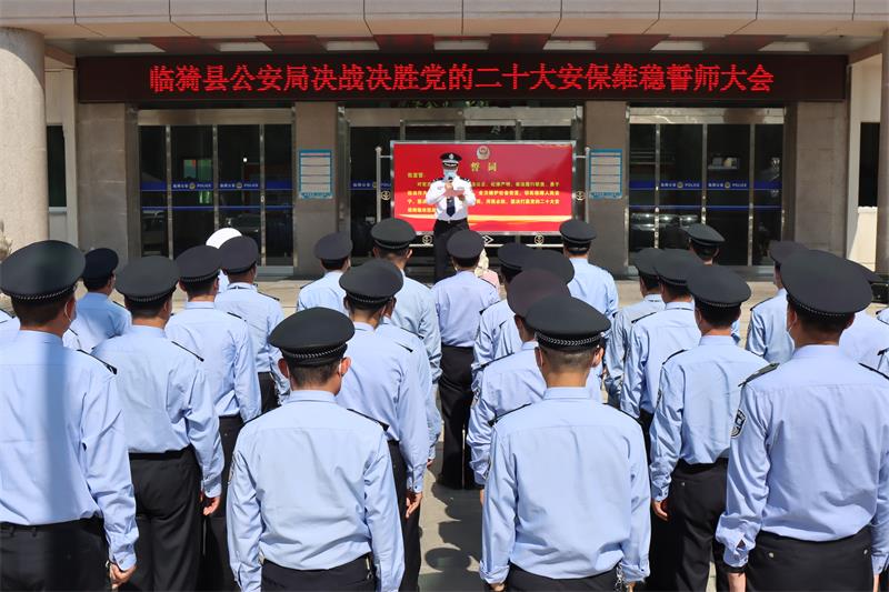 《法制与经济》栏目(杨立涛 通讯员:樊军 董梦)为认真贯彻落实中央和全省、全市党的二十大安保维稳工作动员部署会议精神,进一步强化责任担当,在各项安保维稳措施上再加力、行动上再见效,9月29日上午,临猗县公安局在机关大楼前举行决战决胜党的二十大安保维稳誓师大会。副县长、局长柳晋生主持大会并讲话,局党委班子成员、各派出所所长、指导员及机关全体民警参加大会。