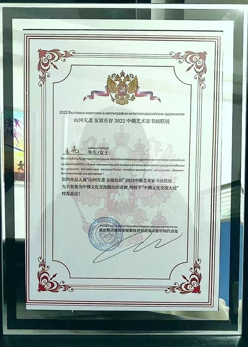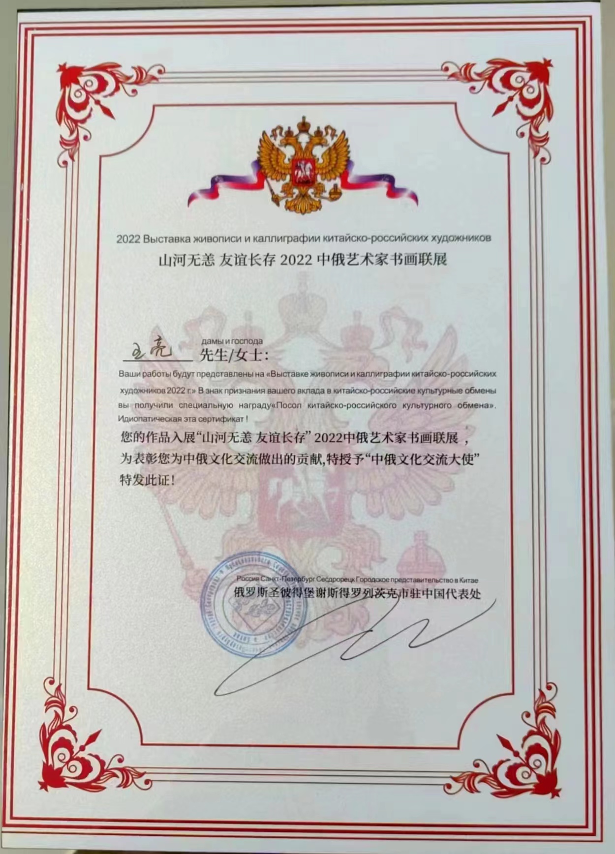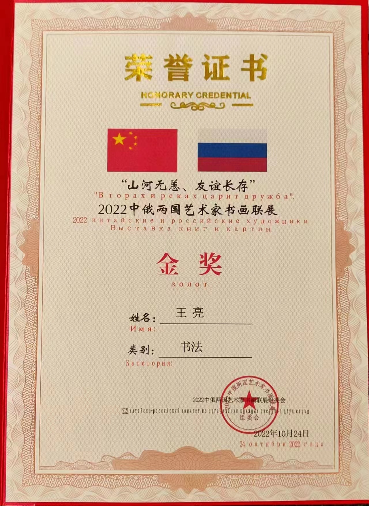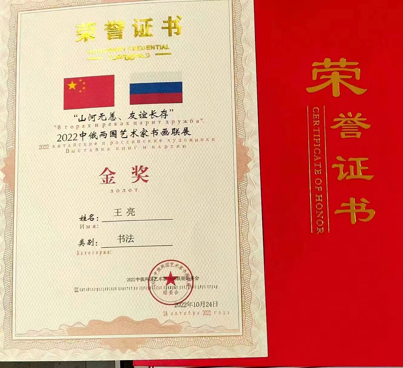 中国数字电视《社会与法》湖南讯:(刘庆芝 图/文 潘利求) 近日,在“山河无恙 友谊长存”2022中俄两国艺术家书画联展颁奖典礼上,陕西书法家王亮行草书《重阳.采桑子》及唐诗作品荣获金奖,并被授予“中俄文化交流大使”。