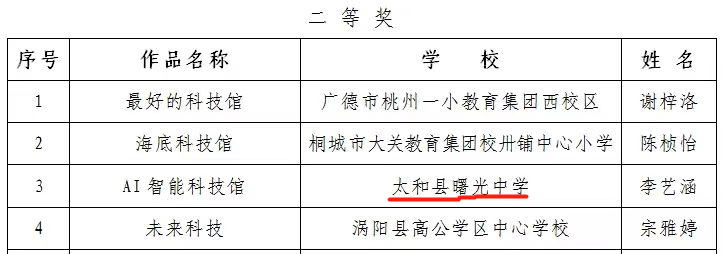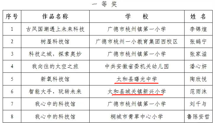 相信孩子在各个方面的才能,已经展现出他们与时俱进、勇于创新、勤于思考、敢于制作和永不退宿的精神,他们是新时代的好孩子,他们历届省市大赛所创造的佳绩,让太和县曙光中心校更自信对孩子全面发展、积极开展素质教育这一坚定不移的方向。