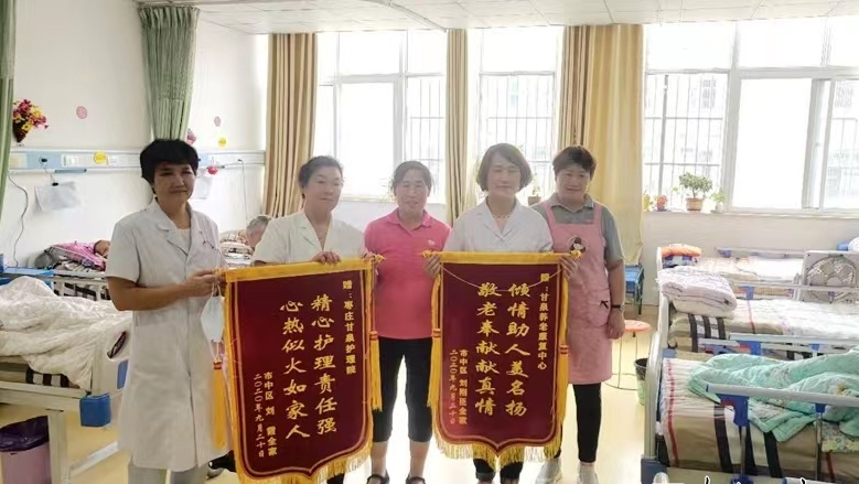 通过四年多来不断的探索与创新、高点定位,无论团队建设还是内在的服务体系,都在推动我市养老事业的发展,目前为止,中心已为600余位老人提供养老服务,其中包括多名红色革命老人:王琳生,88岁,1945年当兵,1947年入党;期间多次获得奖章1970年专业到市中区粮食局局长,1976年乡镇企业局局长;曲云芝94岁,1944年在蓬莱参加工作并秘密入党,1949年蓬莱市法院工作,1981年枣庄市中级人民法院院长;刘宗鲁,95岁,1974年枣庄矿务局退休等等老人;他们所取得成果受到了各级党委政府和有关上级部门领导充分肯定及社会、家属广泛好评,先后收到老人家属赠送锦旗82面; 2016年被授予“枣庄市市中区齐村镇中小学孝心教育实践基地”;2018年度我单位被枣庄市惠众孝养公益联合会、枣庄市中小企业服务中心评为“爱心企业”;2018年度被市中区民政局授予养老服务“先进单位”;2019年12月枣庄市市中区残疾人联合会授予“残疾人托养基地”、2019年度被枣庄市惠众孝养公益联合会、枣庄市中小企业服务中心评为“养老基地”;2019年度被市中区民政局授予养老服务“先进单位”。通过多城市的考察和学习,枣庄市市中区甘泉养老康复中心运营初期首先对入职76名人员到潍坊、青岛进行护理专业知识培训,优选出42名护理人员上岗,以及后期的内培外训整个团队爱心、奉献精神、正能量十足;在生活上根据老人身体状况的不同每个餐厅设计布局不一,餐饮团队有高级厨师、面点师、营养师组成,围绕“滋、养、补”的特点每周为老人提供不同的膳食:早餐配有:粥(汤)、蛋类、花样面点2-4种、小菜等;午间水果加餐;午餐配有:菜类三荤两素、杂粮汤、花样面食5--6种等;午休后养生茶;晚餐配有:菜类两荤一素、汤类、花样面食3--4种等;针对血糖高、牙口不好、少数民族等情况有不同的饮食方案满足老人不同的需求,同时为了方便探视亲属餐饮部随时提供家庭聚餐等宴会服务。在此入住的老人一个月后基本上体重都有所增加,刘宗鲁爷爷说:“这里吃的真好花样又多,我来这里住了2个月胖了10斤多,走路明显有劲了!”,王华芳奶奶的女儿说:“这里的菜饭比俺家做的好多了,看着就想吃”类似的话几乎天天都能听到;1#、2#楼所有区域老人入住房间自理区、半失能区标准间配有两张1.2米豪华木床、床头柜、中央空调、卫生间、淋浴器、浴霸、安全扶手、液晶电视、衣橱、4喷头喷淋报警器、呼叫器、舒适藤椅、茶几等;失能区配有双摇医疗床、高档床头柜、氧气管道、中央空调、卫生间、淋浴器、浴霸、安全扶手、液晶电视、衣橱、8喷头喷淋报警器、呼叫器等设施设备。在确保老人吃好、住好、安全的前提下,中心针对不同的区域提供科学合理的日常照护服务,细微服务项目科学、合理、专业,自创办以来老人褥疮的发生率为零、让老人感到舒心、家属放心! 甘泉养老康复中心三面环山、南靠莲花湖、环境优美、天然氧吧,内置草坪长青、花果树木与木制流亭相伴,整体环境幽静,是老年人颐养天年的最佳住所;每周根据老人的身体状况不同老人开展的活动有手指操、画画、书法、摄影、唱歌、看电影、象棋、麻将、乒乓球、插件、跳舞等项目;一月一次老人集体生日会、定期的社会组织慰问和演出更是丰富了老人精神文化生活。为了满足不同老人的需求,二期项目建设正在筹划中,按照规划设计标准和依山傍水的地理优势,计划以居家、旅居养老为主、占地70.6亩、投资8000万元、设置床位200张;大力发展养老事业、关爱更多的老人、满足各类老人的需求。当你走进甘泉养老康复中心,一股暖流像春风一样扑面而来,老人们个个面带微笑,一起拉家常、下棋、看电视,在一个清洁、舒适的环境里幸福地生活,员工们对待老人就像对待自己的亲人一样,关心、爱护、细心周到、无微不至。老人们亲身感受到了家庭的温暖,真正从心里说这里就是自己的家。去年8月29日,市中区老促会、退役军人事务局的领导一行到康复中心看望这里的老人们,看到员工们正在为老人换衣、做饭,搀扶老人进饭堂、为瘫痪老人喂饭等,情景十分感人,催人泪下。老军人王林生眼含热泪激动滴说:“我在这里生活的很好,就像在家里一样!”。