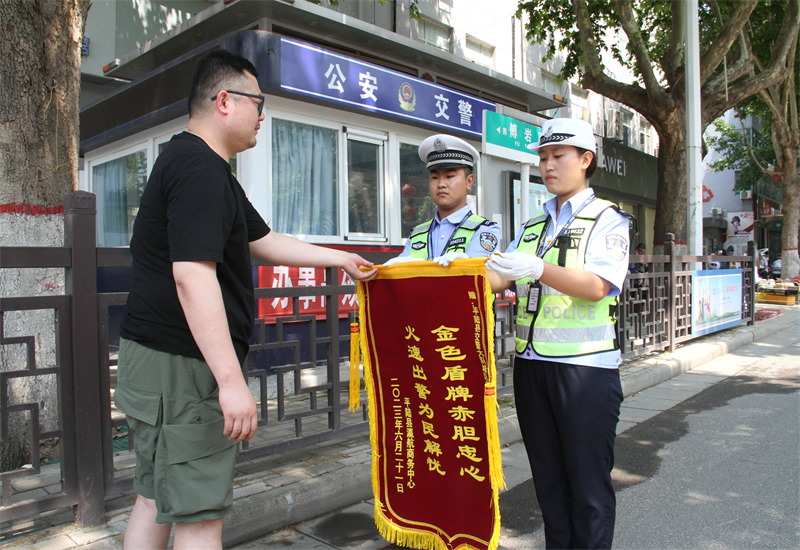 中国数字电视《社会与法》栏目山西讯(樊军 付音)6月25日,平陆县瀛航商务中心工作人员将一面写着“金色盾牌赤胆忠心,火速出警为民解忧”字样的锦旗,送到了平陆县公安局交通管理大队城区中队民警的手中,并感谢道:“是交警的尽职尽责,为商务中心排忧解难。”