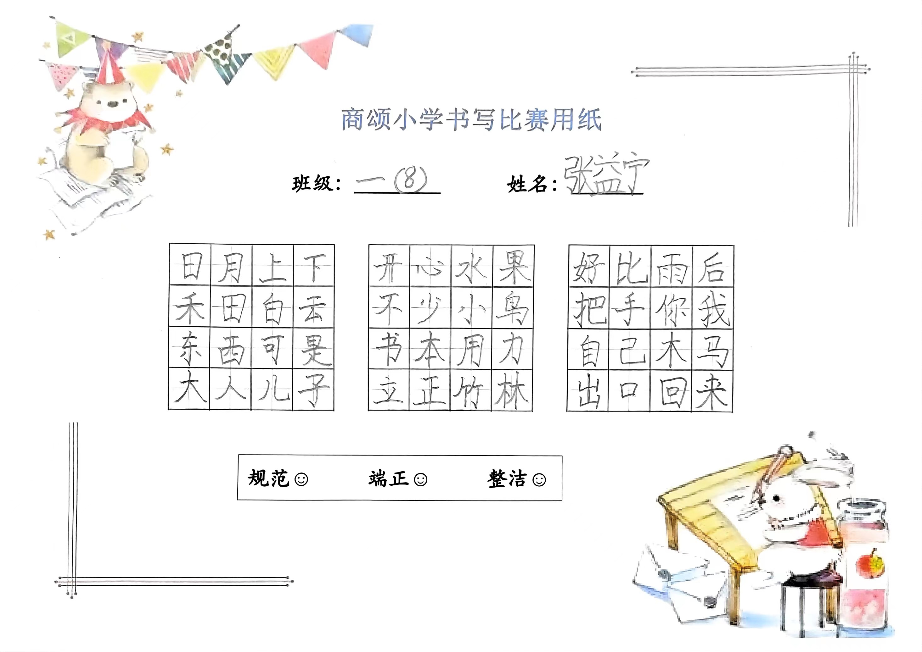 “一点成一字之规,一字乃终篇之准。”一支笔、一张纸,横竖撇捺写童趣。比赛结束,老师们以“规范、端正、整洁”的为评价标准,选出佳作张张,让我们一起来欣赏小豆豆们的作品吧!