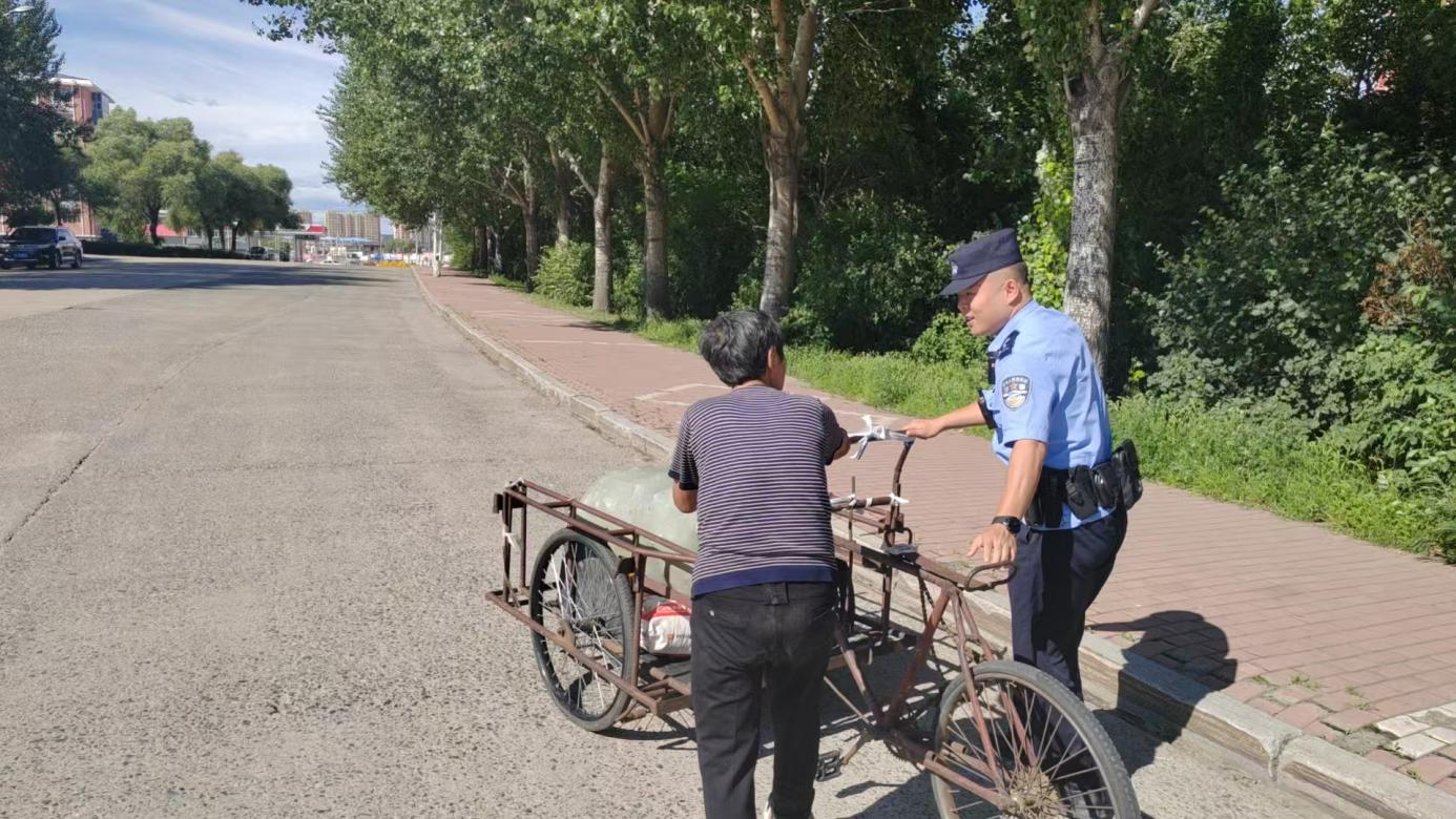 中国中央数字电视《社会与法》栏目黑龙江讯(李玉成)2025年8月10日14时许,黑龙江省哈尔滨市依兰县公安局东城派出所巡逻车组执勤民警刘思宇、孟凡龙驾驶黑A7345警警车巡逻至高级中学附近时,他们注意到一位老人正推着一辆倒骑驴在吃力地上坡。