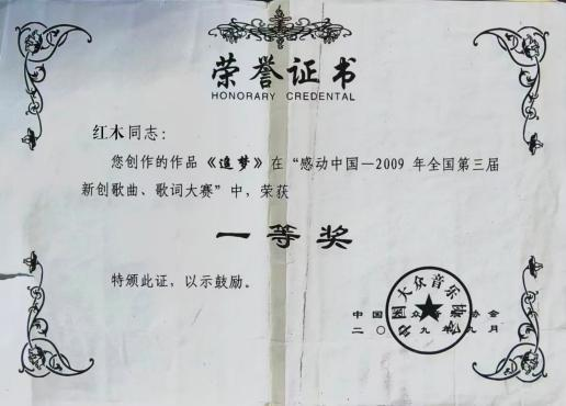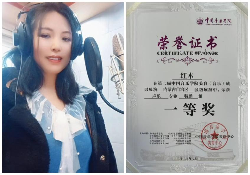 C灵感创作,绽放光芒:红木现荣为中国音乐著作权协会会员,内蒙古音乐家协会会员。中国文联音像出版社出版发行了个人专辑《马背上的女孩》,收录了她原创12首歌曲。她经常在抖音、快手、K歌、QQ音乐等网络平台发表作品。原创作品《乡村新时代》荣获中共兴安盟委宣传部征歌优秀作品奖。原创作品《中国制造我们担当》荣获兴安盟工会征歌一等奖。原创作品《追梦》喜获2009年感动中国新创歌曲一等奖。2025年,红木演唱的《我爱你中国》获中国音乐学院展演美声一等奖。2025年,在第六届“文化之春·中国民族歌曲演创大奖赛”中荣获中国民歌演唱家金奖。