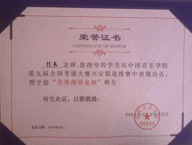 D梦想闪光,奔向远方:红木靠着音乐上的天赋和闪光的荣誉,吸引了孩子和家长的目光,她们很信任让她教授孩子们歌唱。值得一提的是她指导的学生在全国考级大赛中表现出色,为此,中国音乐学院考级委员会授予红木“优秀指导老师”荣誉称号。